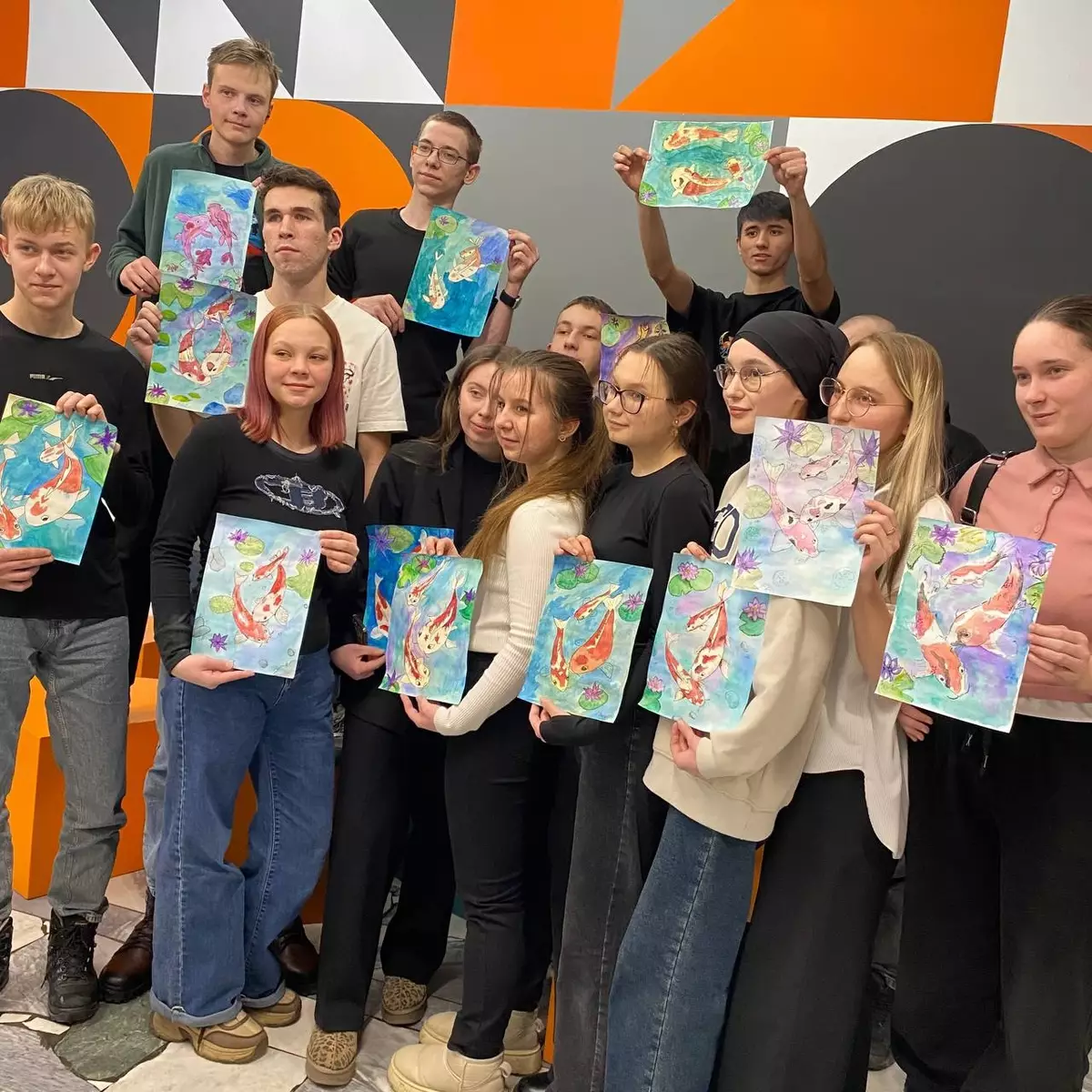 В ходе мастер-класса мы рисовали рыбок кои в пруду. Использовали акварель, активно смешивали цвета, делали брызги и полностью погрузились в процесс рисования.